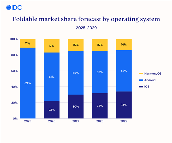 市场预测显示,苹果的入局将对折叠屏市场产生重大影响。根据IDC最新报告,苹果明年将凭借22%的市场份额直接跻身全球折叠屏手机前三名,超越华为等长期布局折叠屏市场的品牌,进一步巩固其在全球市场的领导地位。